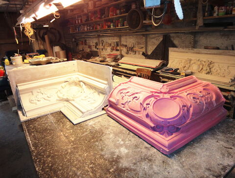 Auf 200 m² Werkstattfläche stellen wir alle Stuckarbeiten her, die nicht direkt am Gebäude vorgenommen werden – etwa Ornamente, Konsolen oder Baluster. Damit halten wir uns exakt an die Arbeitsabläufe aus der Entstehungszeit des jeweiligen Baudenkmals.